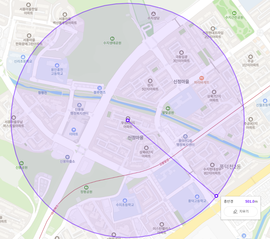 800m 정도 되는 거리로, 도보 외에도 수지구청역까지 가는 버스편들도 있으니 충분히 참고 가능할 것 같습니다.